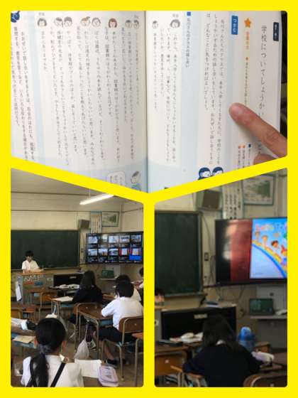今日の4時間目に、1年1組に行って「学校について」しょうかいしました。