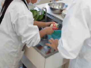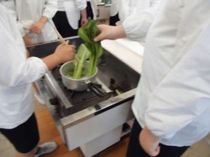 調理実習で、青菜とジャガイモをゆでました。ジャガイモは、ピーラーで皮をむいた後、ゆでました。