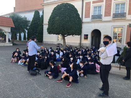 宿舎に出発するために、シベレス広場に集まりました。まだまだ、スペイン村で活動したいようです。