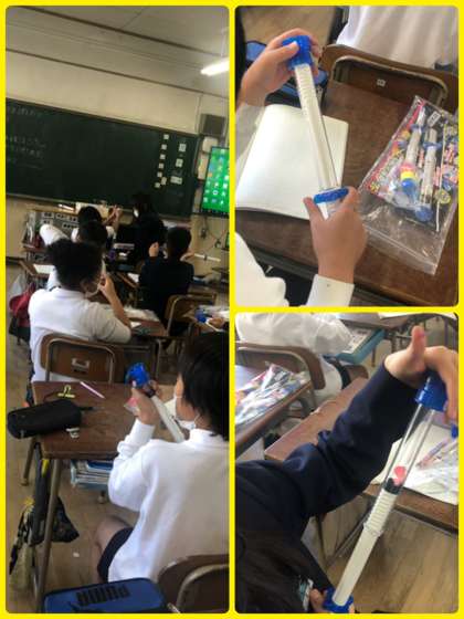 閉じ込めた空気を圧すと、体積は小さくなるが、圧し返す力は大きくなることなど、空気の性質について実験しました。