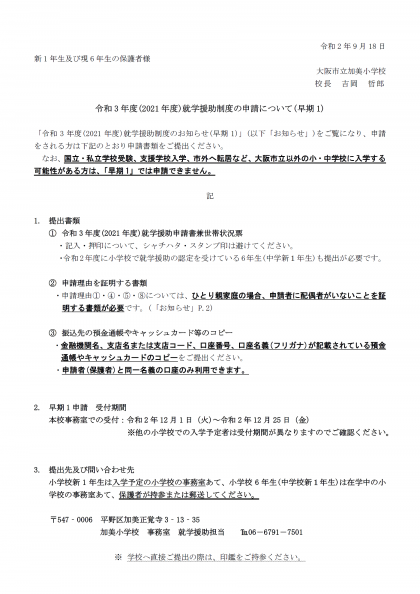 申請を希望される方につきましては、本校より9月に配布しております「令和3年度(2021年度)就学援助制度の申請について」の文書をご覧のうえ、お申し込みください。