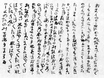 母シカが英世に宛てた手紙です。シカは幼いころ、文字を覚えはしましたが、その後ほとんど文字を書く機会がありませんでした。後に英世は、母が字が書けるとは知らなかったと語っています。「はやくきてくたされ はやくきてくたされ いしよのたのみてありまする」(早く帰って来てください。早く帰って来てください。一生のお願いです。)と、