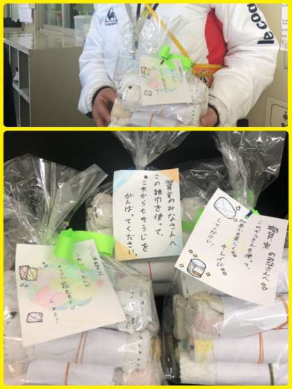 卒業生から、在校生と教職員へ「ぞうきん」の贈り物です。