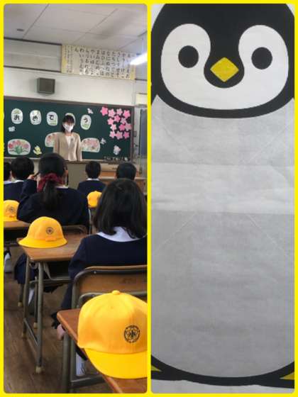 あれ、何か出て来たぞ!(ペンギンの絵がステージに出てきます。)ペンギンだね。ペンギンは、群れを作って生活をしています。そして海の中の魚をとるために、何百羽というペンギンが一斉に海に飛び込みます。そんなシーンをテレビで見たことありませんか。ところが、この群れが海に飛び込むまえに、誰より先に、たった一羽のペンギンが海に飛び込むんです。誰かが飛び込むからではありません。自分の意志で自分で決めて飛び込みます。このペンギンのことをファーストペンギンと言います。このペンギンがいるからこそ、あとの何百羽のペンギンは、飛び込むことが出来ます。すごい勇気だよね。校長先生は、皆さんにファーストペンギンのような人になってほしいと願っています。
