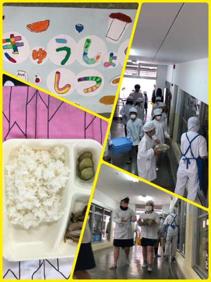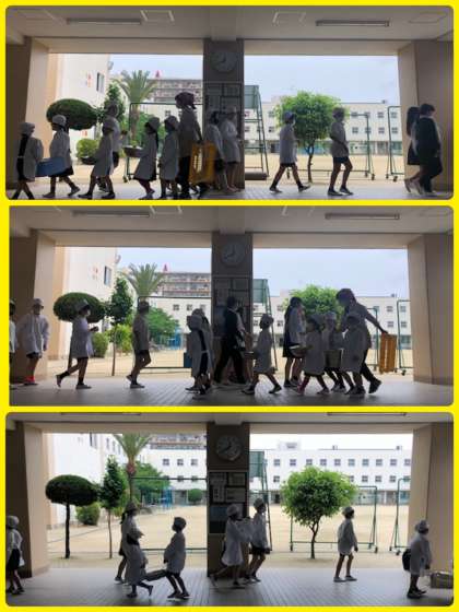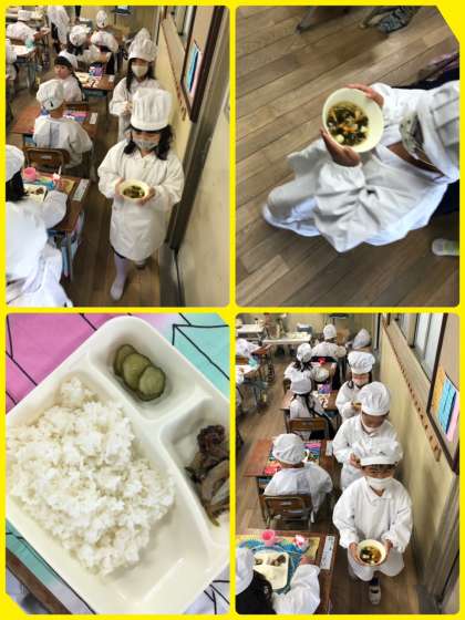 一年生教室・・・むかしは、給食係が配膳をしていましたが、今は、自分の汁椀もお皿も、自分で持っていきます。丁寧ゆっくり持っていきます。