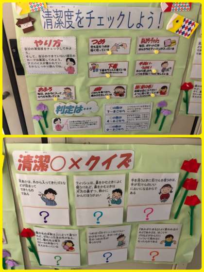 保健室のドアには、子どもたちが興味関心を持つように工夫されたポスターなどが掲示されています。保健室の先生の手作りです。