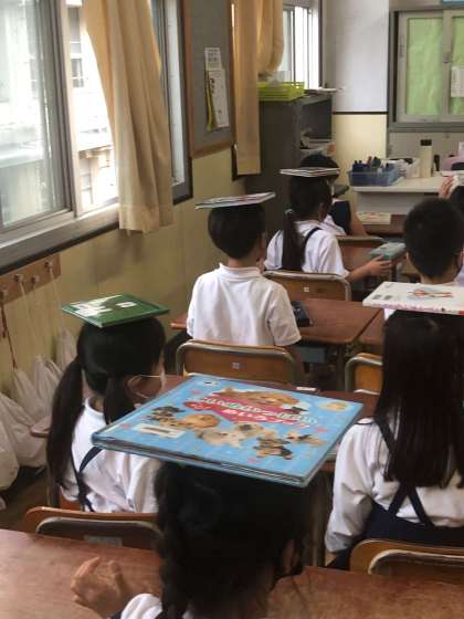 うまいね、もう一度やって見せて!というと、周りの子も、頭に本をのせ始めました。