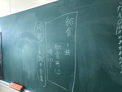 写真下:放送委員会→校歌をを練習する機会がなかなかありません。定期的に放送し、耳で覚えるようにする取り組みです。放送委員会が協力してくれます。