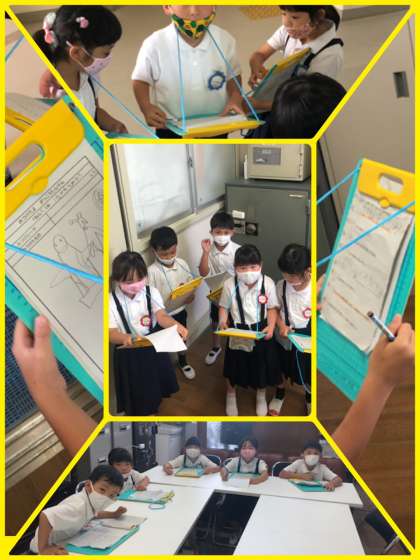たくさん質問をしました。ひらがなで、一生懸命に答えを書きとります。校長室の中にあるものを描きます。楽しかったね。