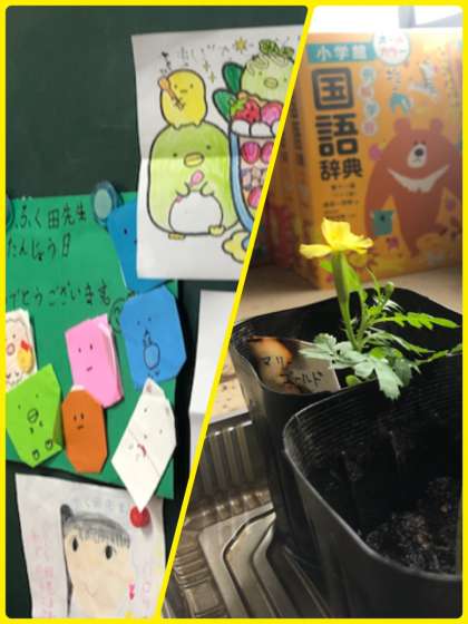 先生の誕生日にみんなが書いたカードが貼ってありました。学校が楽しくなるような言葉がたくさん書いてありました!!