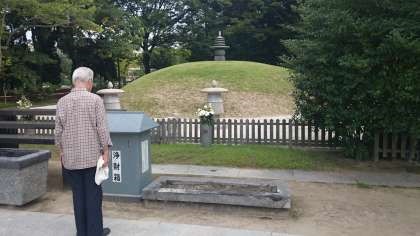 20数名の砂利をふむ音も消え、いよいよ供養塔の前に進み出ようとしたとき、新たに一人の老人が塔の前に歩み出ました。そして、不動の姿勢のまま、長い間動きません。その後ろ姿を私はずっと見ていました。