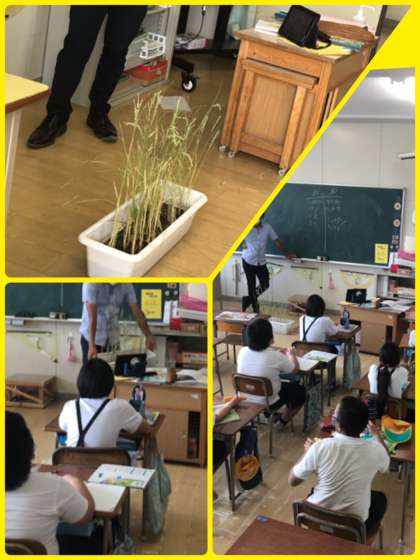 教室のパソコンのカメラに「稲」を近づけ、自宅にいる子どもたちも観察できるようにしていました。このクラスは、10名ほどの子どもたちが自宅から授業を受けました。