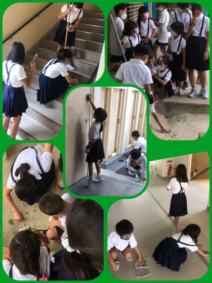 何やら子どもたちが集まってワイワイやっています。毛虫や幼虫らしき虫がたくさんいます。掃除の時間だから遊んでないで、掃除をしましょう!と言わなくてはいけないところですが、掃除したり、模様替えしたり、押し入れの整理をしたりすると、大人でもふと手を止めて、違うことをしてしまうことがあるなぁと、注意できずに見ていたら、すーっとそうじに戻りました。子どもたちは、“程度(ほど)”を知ってるようです。よかった。(文責:校長)