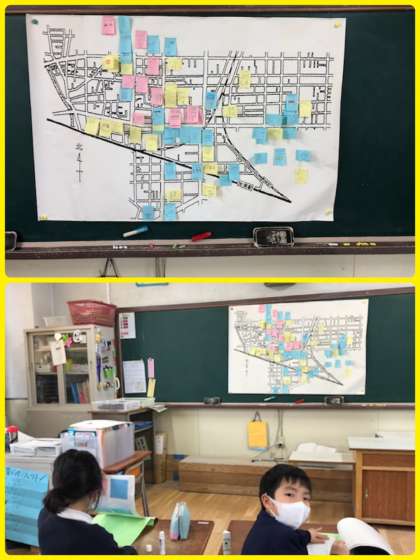 町たんけんの事前学習です。拡大した加美の街の地図に色とりどりのマークがついています。