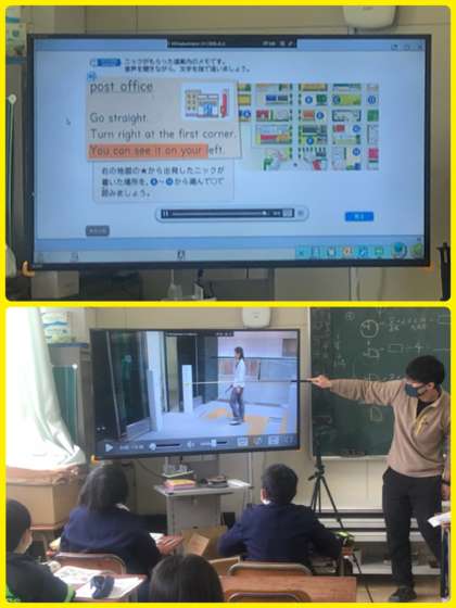 町の中で見つけたユニバーサルデザインの活用例を英語のビデオで見ます。子どもたちが興味を持つことができて、内容がよく分かる話題で英語を学んでいきます。