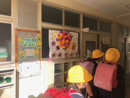 校舎の中にも「卒業をお祝いする掲示」が、花のようです。