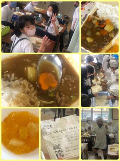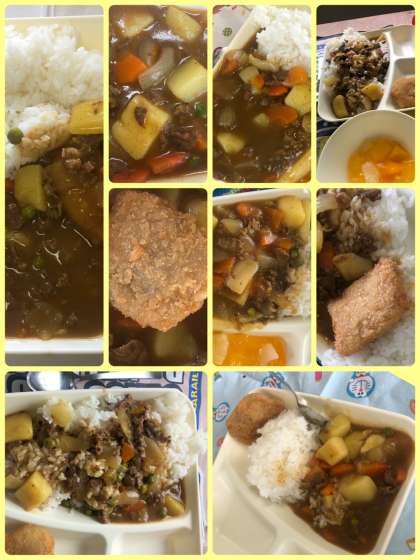 今日のきゅしょくは一番人気のあるカレーライス(ラッキーニンジン入り)です。それもカツがついています。