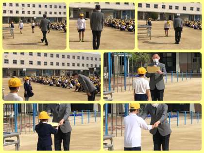 全校のみんなの前に出てきてくれた3人には、令和4年度最初の「感謝状」をおくりました。