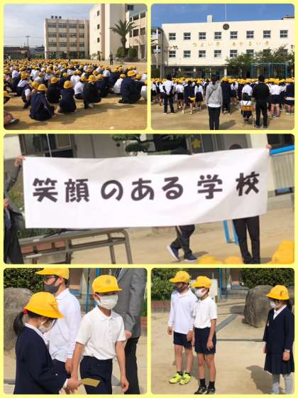 ・3年の女子です。運動場の子どもたち全員にスーっと届いていく素敵な声のあいさつです。みんなから拍手が起こりました。「朝、元気にあいさつすると、いつでも元気になれる」と言うこの子のあいさつで、毎朝、元気をもらっています。