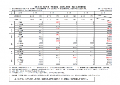 ※上記の2枚目の「令和4(2022)年度 学校徴収金 月別納入予定額一覧表(生活保護家庭)」の赤字のところは金額額変更になっております。