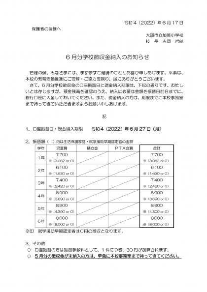 なお、6月分学校徴収金の銀行振替日は、「6月27日(月)」となっておりますので、前日までに学校届出の口座へご入金いただきますよう、お願いいたします。