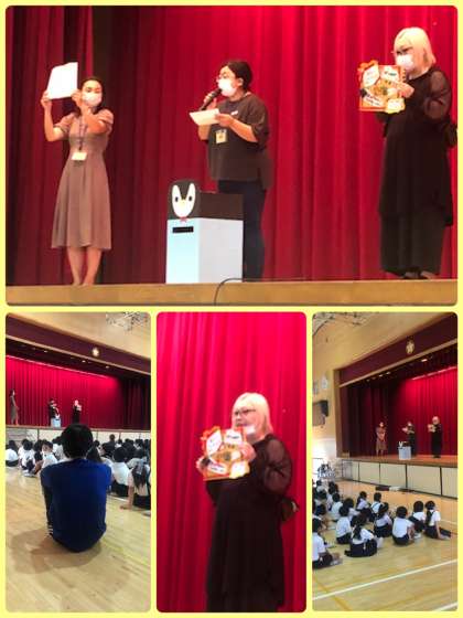 PTA親子でミッションプロジェクトのメンバーの方に登壇いただき、子どもたちに直接ご説明していただきました。(写真:左からPTA会長・野村さん、PTメンバー・杉野さん・中村さん)