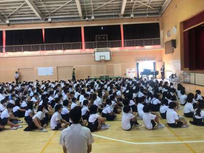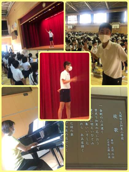 最後に、校歌を歌いました。みんなマスクをしています。大きな声では歌えませんが、元気に指揮をしてくれた子に合わせて、みんなでしっかりと歌いました!!