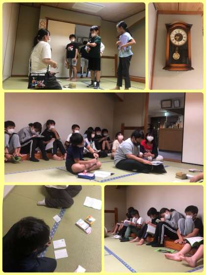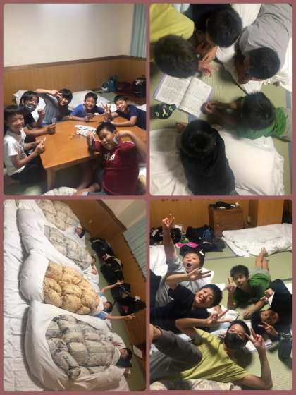 ウオークラリー、飯ごうすいさん(薪で火をおこすの大変でした)、焼き板、体育館でスポーツ、ハガキ書き、ナイトハイク・・部屋のなかでは、トランプやナイショのお話・・・部屋から聞こえる大爆笑や歌声。楽しかったかな!おやすみなさい!また明日。