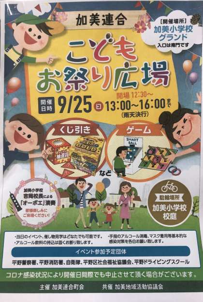 加美連合町会の主催、加美地域活動協議会の共催で、9月25日(日)に『こどもお祭り広場』が開催されます。