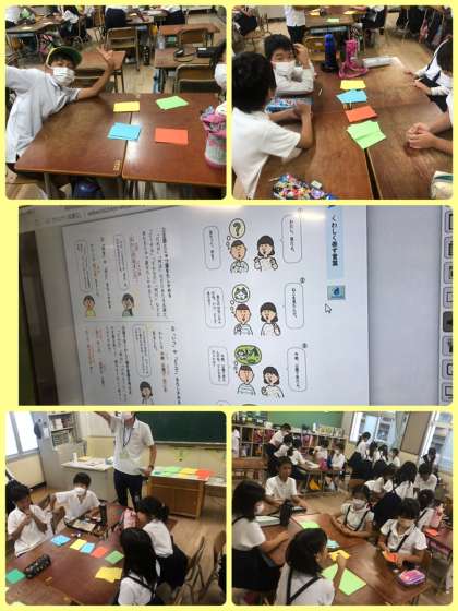 主語、述語・・と色分けしたカードに、あてはまる語句を書き込み、思い思いの語句の組み合わせで文を作りました。