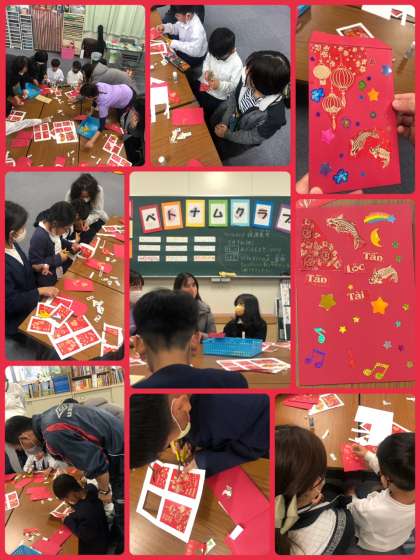 お正月にはつきものの、お年玉!ベトナムでは、きれいな装飾をした赤い封筒のお年玉袋です。ベトナムクラブの子どもたちが、ベトナムの先生に習いながら作りました。なんてきれいなんでしょうか!お年玉袋に書いてあるベトナム語も読んでもらいました。