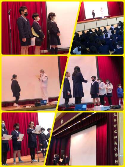 児童会の代表委員会による「あいさつラリー」の表彰もしました。2学期に2回実施した「あいさつ」向上のための取り組みでした。みるみる明るく丁寧なあいさつになっていきました。子どもたち同士での取り組みがどんなに大切なのかが分かりました。これからも期待しています。