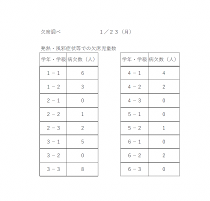 発熱・風邪症状等で欠席する児童が増えてきました。毎日の欠席状況をお知らせしますので、ご家庭でも子どもたちの体調に注意してください。