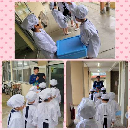 昨日までは、6年生が給食の食器などを運んでくれました。6年生のお兄さんとお姉さんにお礼の花束(自分の名前を書いたカード)を渡している様子です。今日からは、自分達で給食の準備をします。頼もしくなった1年生です。