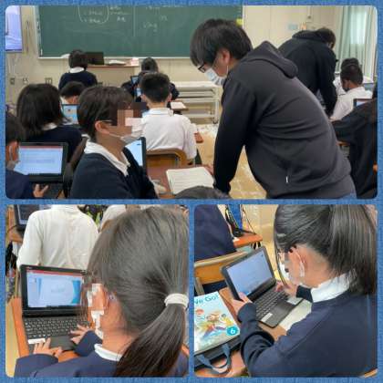 英語の授業の様子です。自分の好きなことやできることをなどについて自己紹介文を英語で書き、タブレットで画像を作って発表するようです。