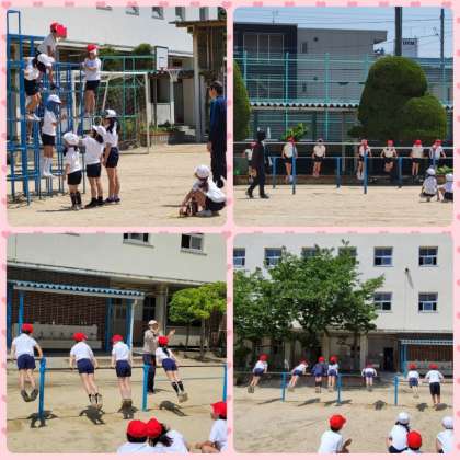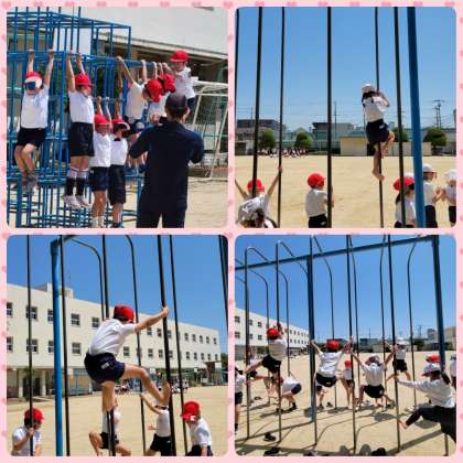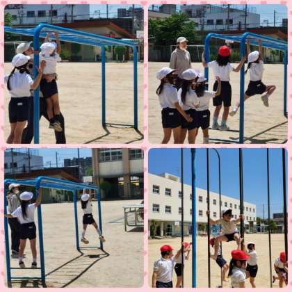 体育の授業の様子です。ジャングルジム、のぼりぼう、鉄棒、うんていなどで運動をしました。