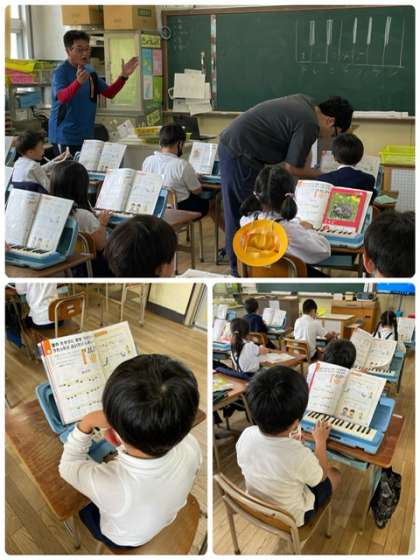 先生の かっこうの歌の声に負けないように 頑張って演奏しています。