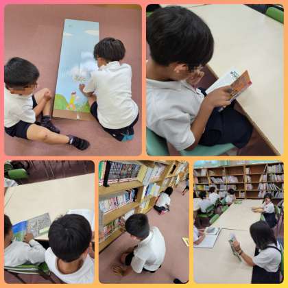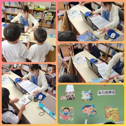 お昼休みの図書室には、子ども達がたくさん集まり、本を返したり借りたりしています。友達と一緒に、本を探したり、読んだりするのも楽しいようです。