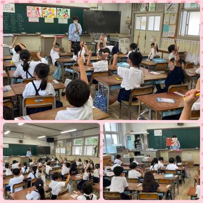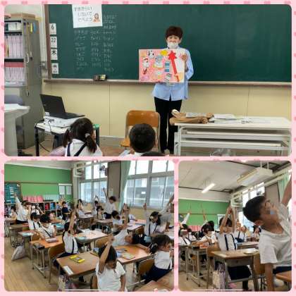 栄養教諭の先生に来ていただいて、栄養指導がありました。1年生は、「すききらいしないでたべよう」という学習でした。