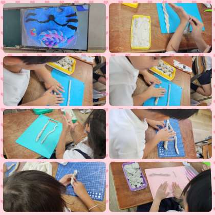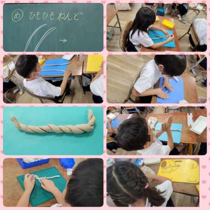 粘土で2本のひもを作り、編んでいきます。一生懸命、同じ太さになるように作っていました。