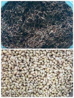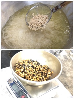 「ひじき豆」は、大豆にでんぷんをまぶし、油であげて、ひじき、さとう、こいくちしょうゆを合わせて煮つめたタレにからませて作ります。