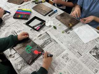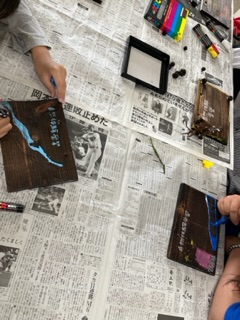 焼き板づくりをしています。みんなそれぞれ工夫して仕上げています。