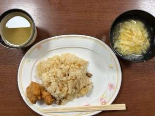 昼食は、炊き込みご飯とからあげ、卵スープです。