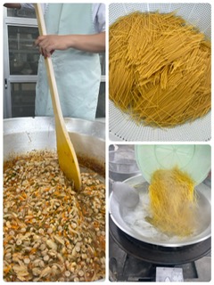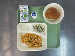 メニューはオイスターソース焼きそば.えだまめ.パン.牛乳.固形チーズです。