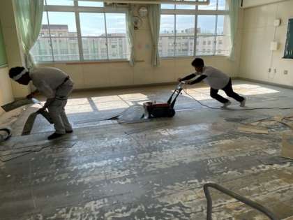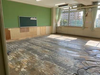 5年生の教室床が激しく傷み、劣化しているため、3学級まとめて補修を行いました。
