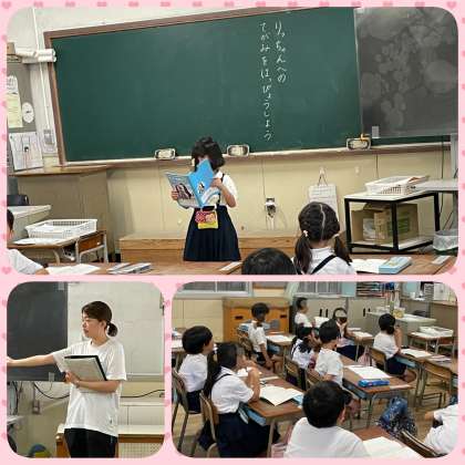 「サラダでげんき」に登場するりっちゃんに手紙を書きました。みんなの前で発表しています。