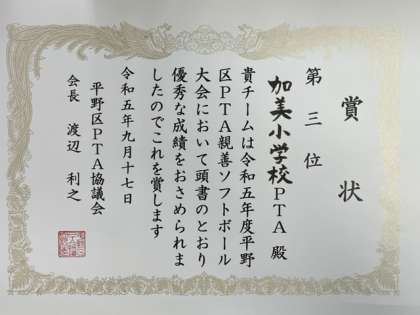 7月23日、9月17日におこなわれました、平野区PTA親善ソフトボール大会で3位に入賞しました。おめでとうございます。