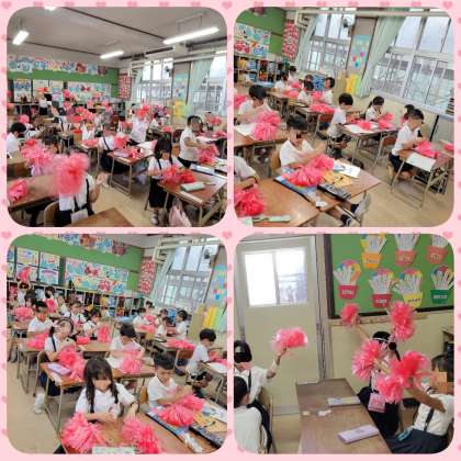 ダンスで使うポンポンを作っていました。