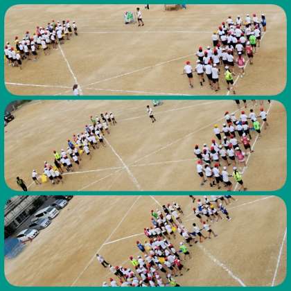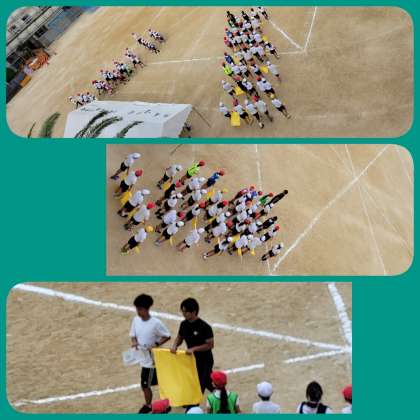 6年生の団体演技では、フラッグを使います。一人一人の動きは単調でも、集団で表現することで見応えのあるものになります。今日は、フラッグの演技で難しいとされる「交差」の練習をしていました。