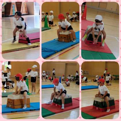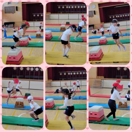 体育の授業で「跳び箱遊び」をしています。先生の話をよく聞いて、準備と片付けもだんだん自分達でできるようになってきました。